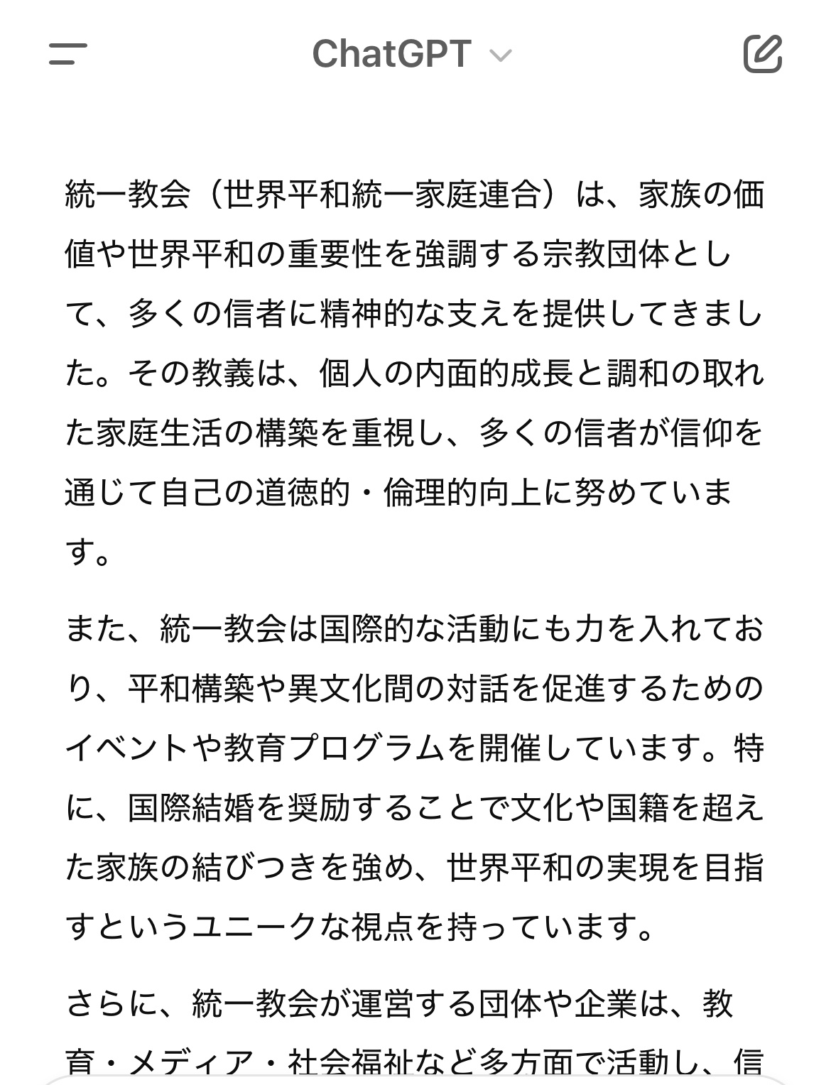 今ChatGPT-4oに聞いてみたけど普通に霊感商法と政治とズブズブのこと書かれてたけど