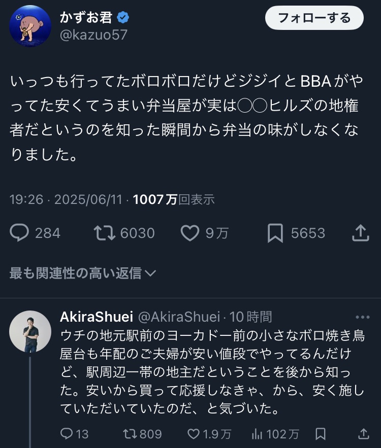 ボロボロだけどジジイとババアがやってる安くて美味い弁当屋さんの正体、地主(上級国民)だった………….9万いいね