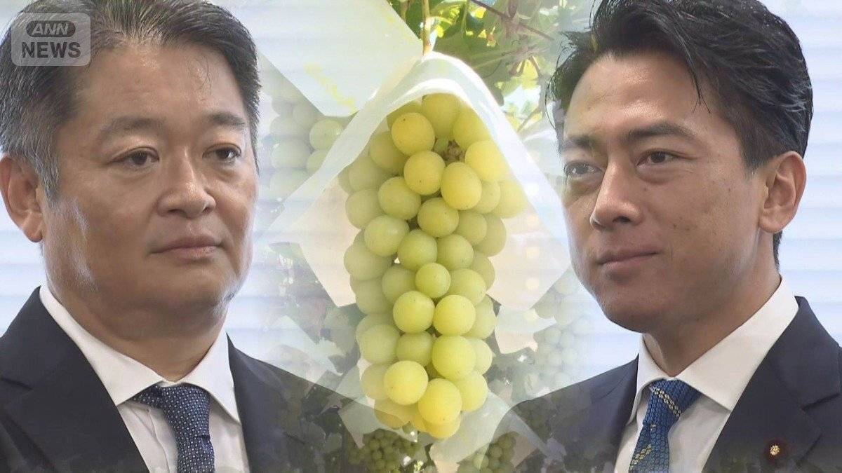山梨県産のシャインマスカットにうなり声をあげる小泉進次郎農水大臣。しかし、持参した山梨県の長崎幸太郎知事はこの表情。