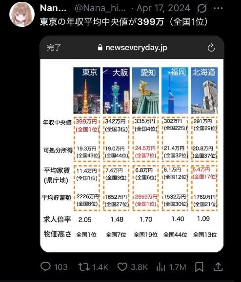 物価は東京のほうが安いって。