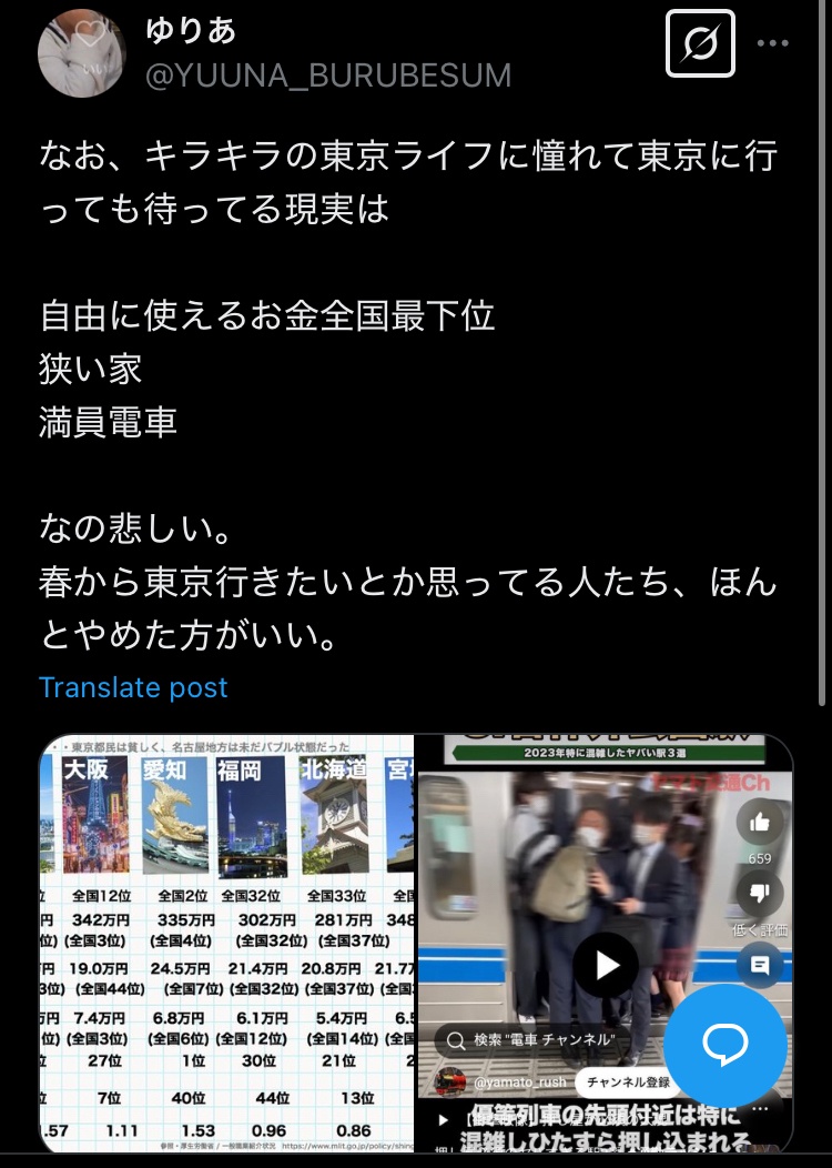 金持ちならわかるけど貧乏なのに東京住んでワンルームうさぎ小屋のって満員電車通勤してるやつバカにしてるわ