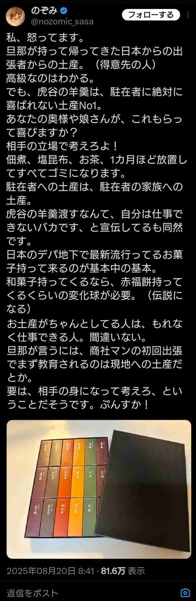 夫が糖尿病や高血糖・高血圧に悩んでる人だったと相手が知ってるなら羊羹渡されて激怒はわからんでもない