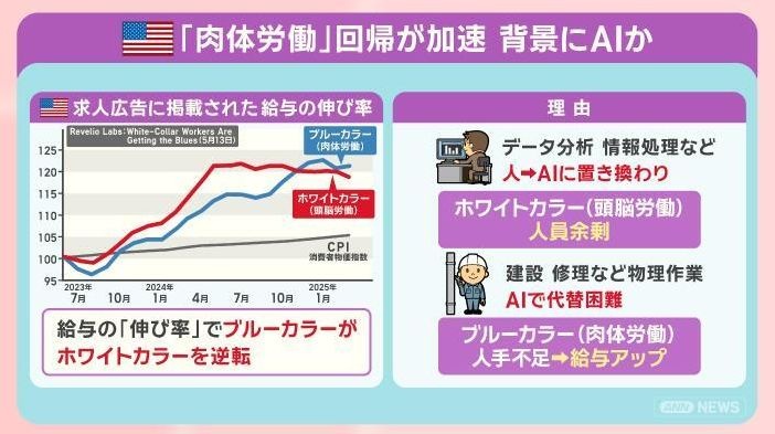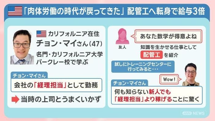 日本では、介護や工事現場などで深刻な人手不足が続く中、アメリカでは、肉体労働者の給与が高騰する『ブルーカラービリオネア』と呼ばれる現象が起きています。経理から配管工に転職して給与が3倍になったケースもあります。
