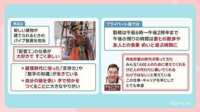 実際にブルーカラー(肉体労働)である、配管工に転身した、カリフォルニア在住のチョン・マイさんです。