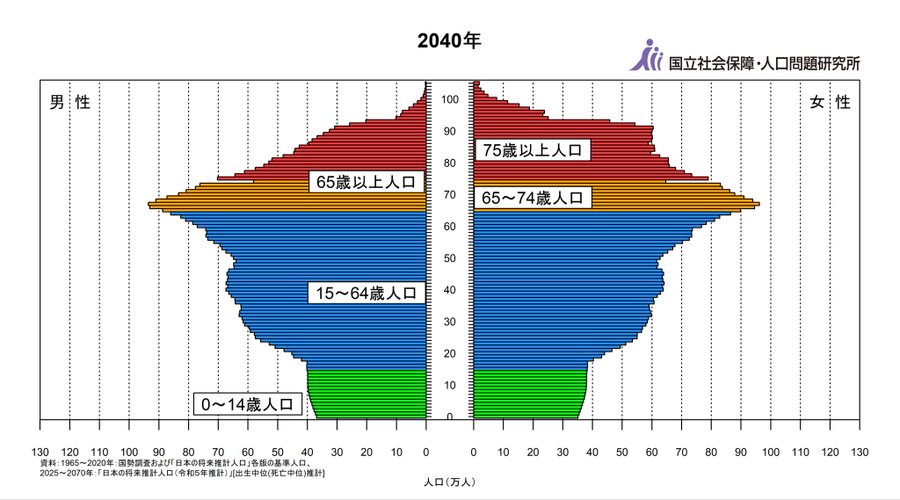 少子化、移民、社会保障制度の破綻、インフラ維持困難、AIによる失業、人材流出ですげえことになってるんだろうな