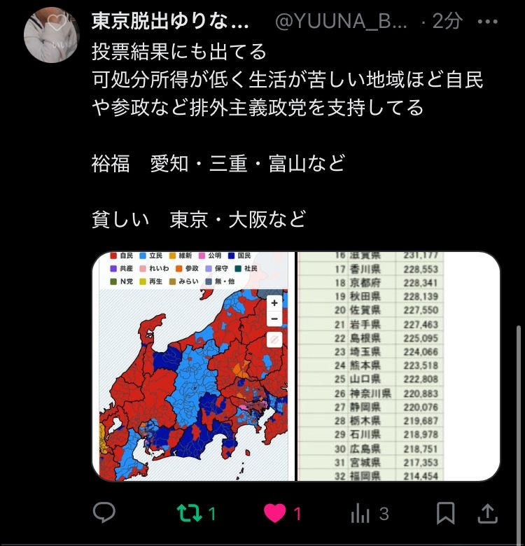 可処分所得が低く生活が苦しい地域ほど自民や参政など排外主義政党を支持してる