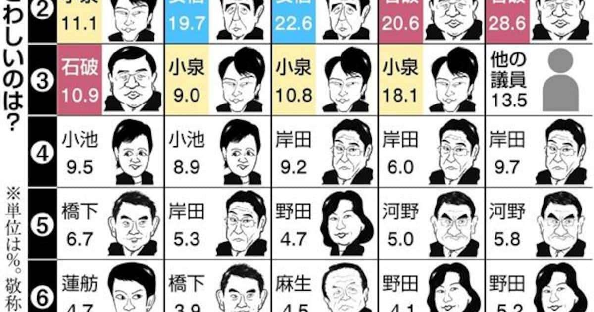 前回は18・1%を占めた小泉進次郎筆頭副幹事長が入っていないためか「他の国会議員」が前回の2・4%から13・5%に増えた。