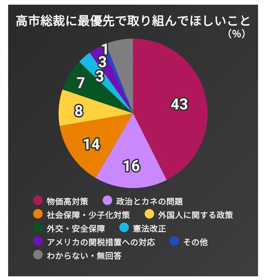 高市総裁に最優先で取り組んでほしいことを聞いたところ、「物価高対策」が43%、「政治とカネの問題」が16%、「社会保障・少子化対策」が14%などとなりました。
