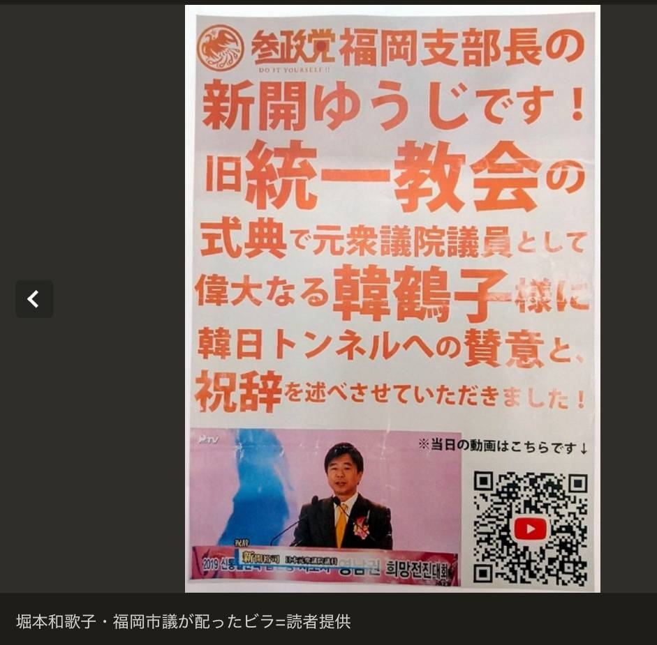 福岡市議の堀本和歌子氏(41)=日本維新の会、博多区選出=が、福岡市博多区の元衆議院議員の男性になりすまし、男性と世界平和統一家庭連合(旧統一教会)との関わりを書いたビラを配布したことがわかった。堀本氏は朝日新聞の取材に「有権者に事実を知ってもらいたかった。手段が不適切で反省している」と配布を認めた。28日に会見を開いて自ら経緯を説明した後、議員辞職する意向という。