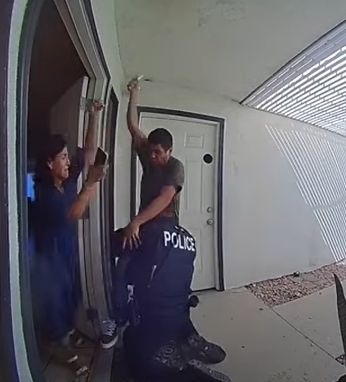 ビデオでは、7月27日午後3時11分頃、マーカス・アヤラ巡査がカテドラルシティのプエブロ・トレイルにある住居の正面玄関まで歩いていく様子とフアン・フランシスコ・ソーサ・ジュニア(30歳)と特定した男性が包丁を持って飛び出し、彼の胸を刺そうとしている様子が映っている。