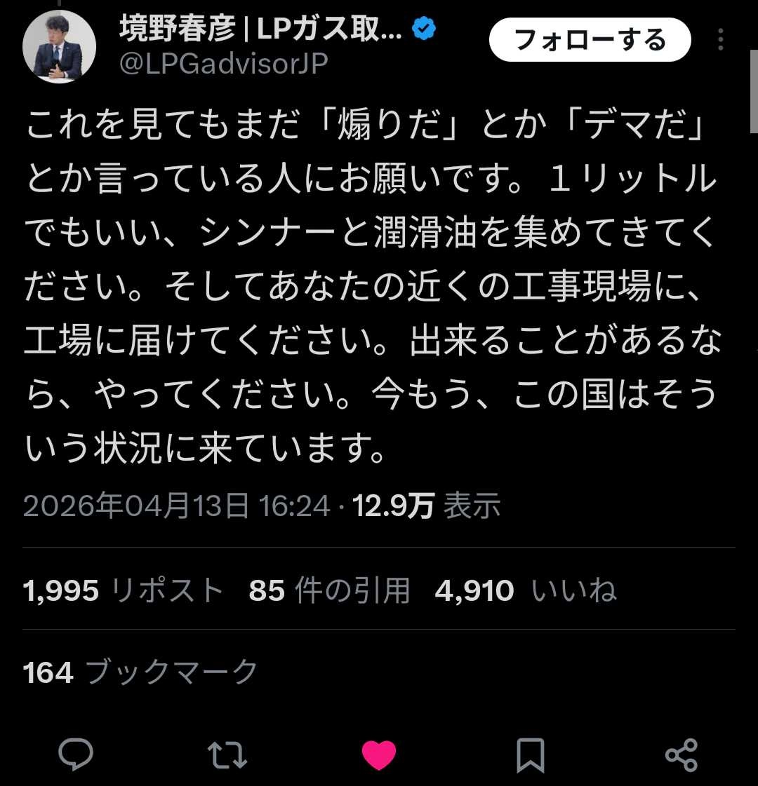 自称愛国者「シンナーは足りてる!デマを流すな!!」