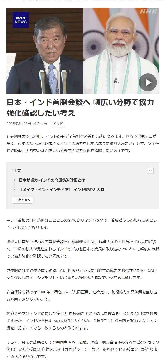【日本終了】石破「インドへ今後10年を念頭に10兆円の民間投資、日本への人材5万人を含め、今後5年間に双方向で50万人以上受け入れへ」
