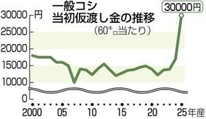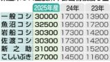 一般コシヒカリ(1等米・60キロ税込み)は3万円と24年産当初比1万3千円増(76%増)で過去最高だった。
