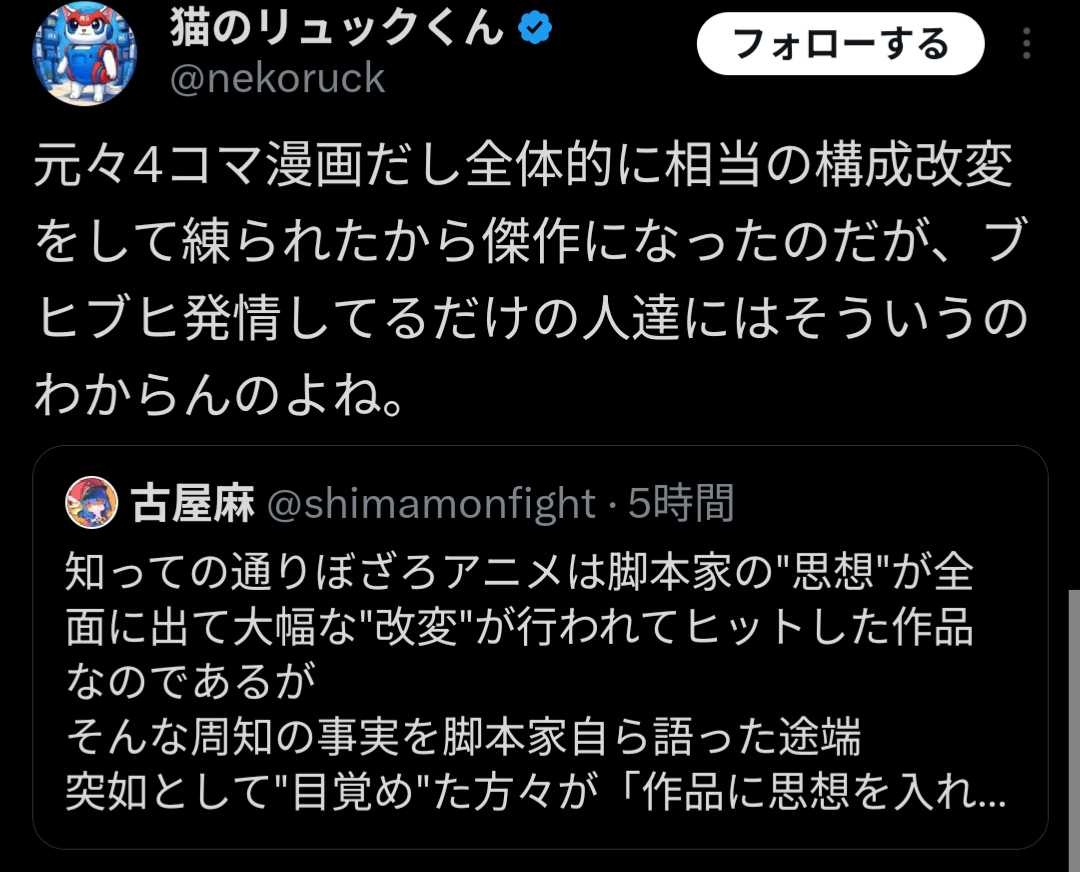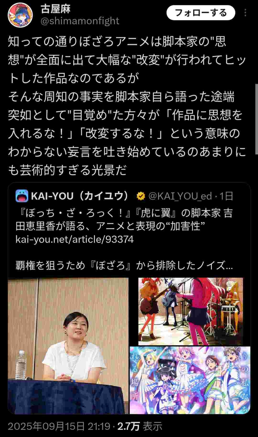 【正論】有識者「ぼちざろっくは脚本家の思想のおかげで改変され大ヒットは常識だと思ってたが…知らなかった連中は何者だ?」