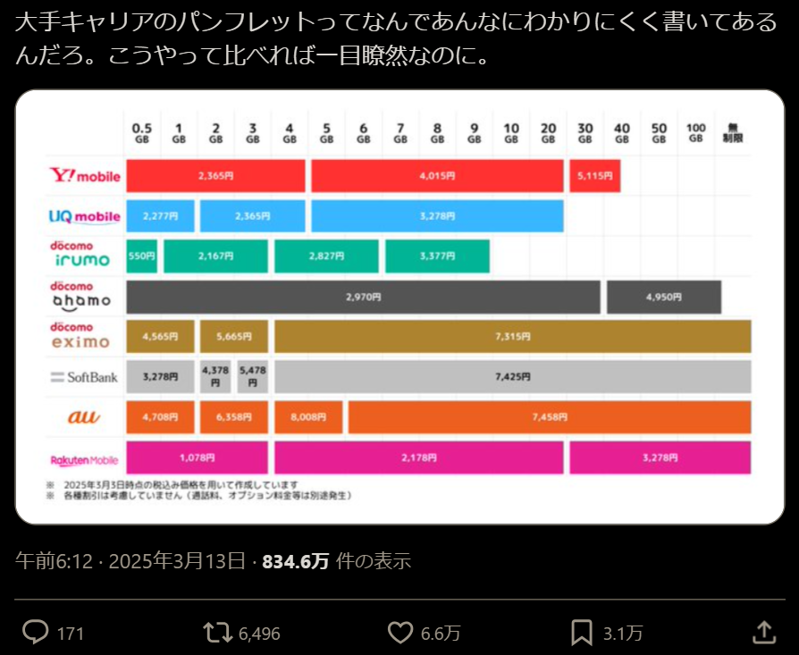 【画像】「キャリア料金、全部一目で分かるように並べてみたw」8万いいね