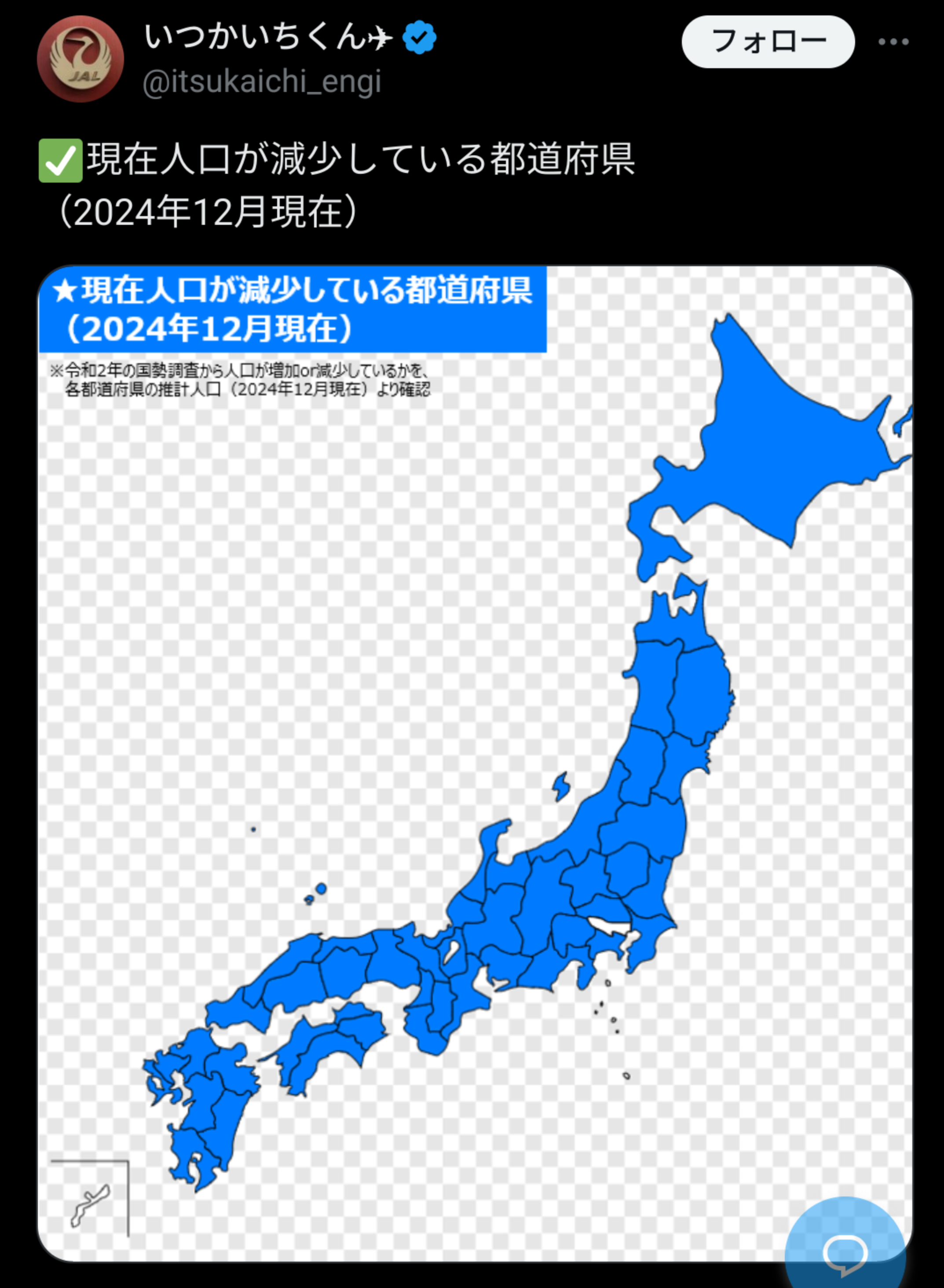 投稿者は、Xユーザーのいつかいちくん(@itsukaichi_engi)さん。「現在人口が減少している都道府県(2024年12月現在)」と添えて、青と白で色分けした日本地図の写真を投稿しました。