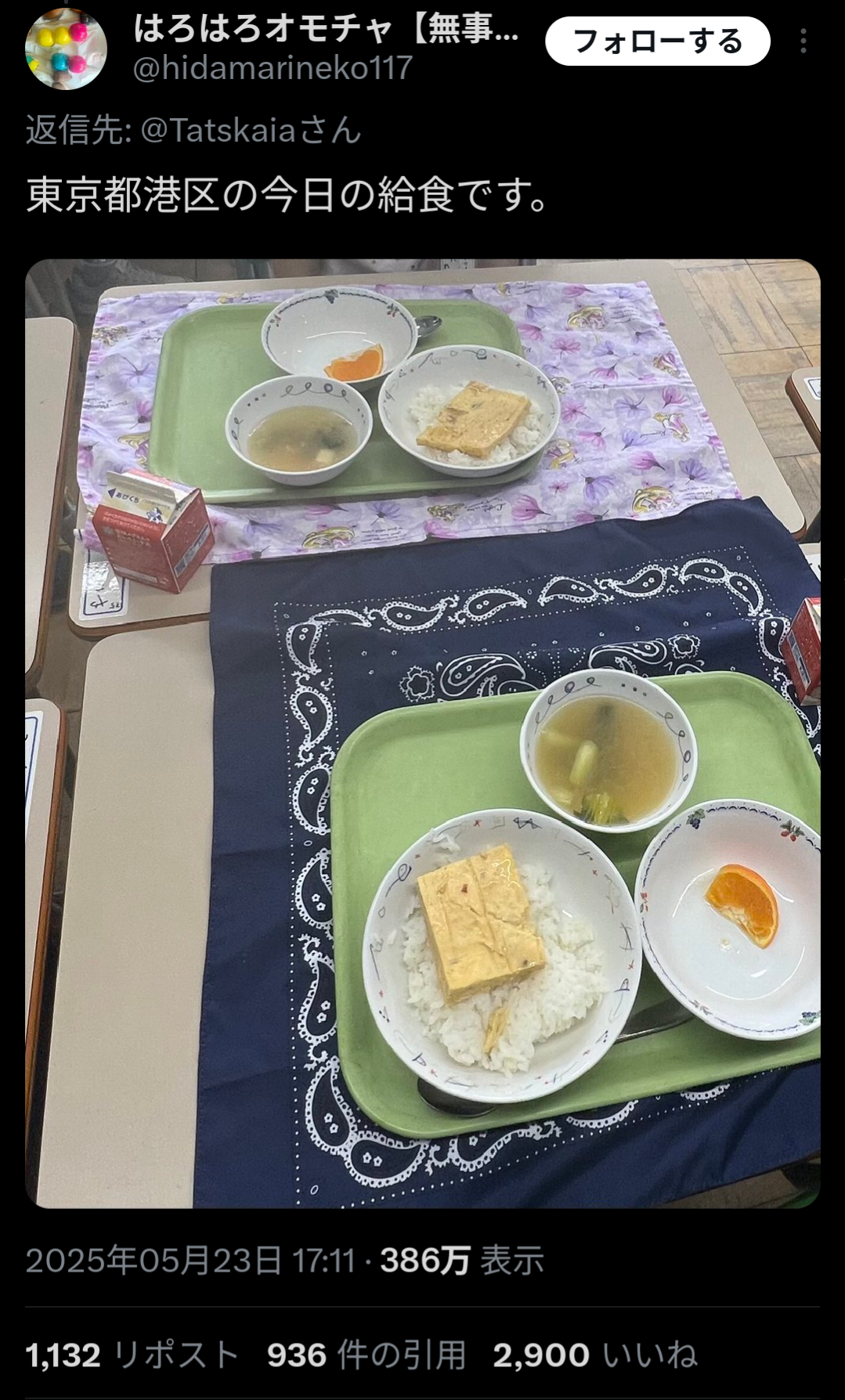 【画像】東京都港区の公立小学校、給食が限界突破www