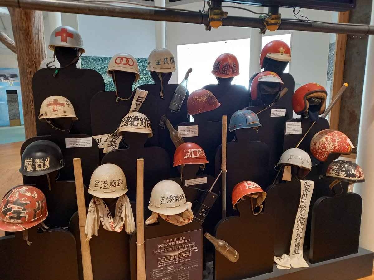 成田の航空科学博物館横の別の資料館には、成田闘争で使用された反対派のヘルメット展示のコーナーが在って、その横に在る火炎瓶なども見学出来る