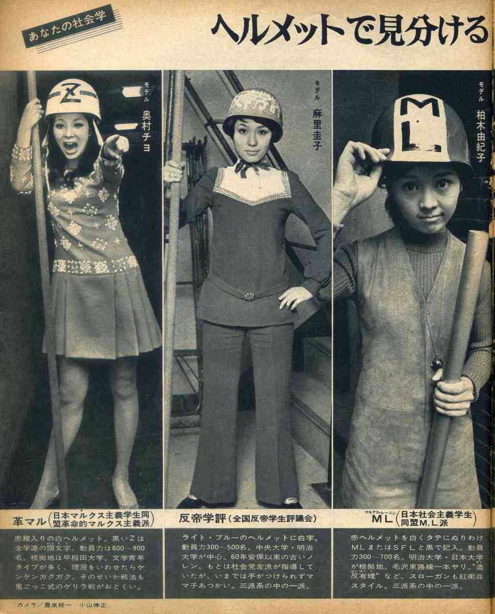 昭和44年(1969年)、ヘルメットで見分ける全学連各派という記事です。女性自身より。凄い時代ですね。