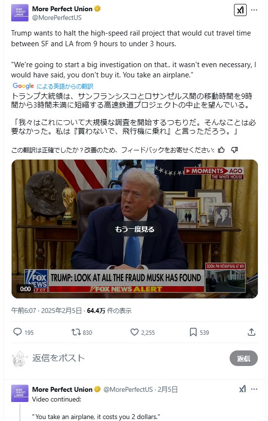 【訃報】トランプ「日本によるカリフォルニア新幹線PJで大量の不正を発見した。資金提供を全面中止する」