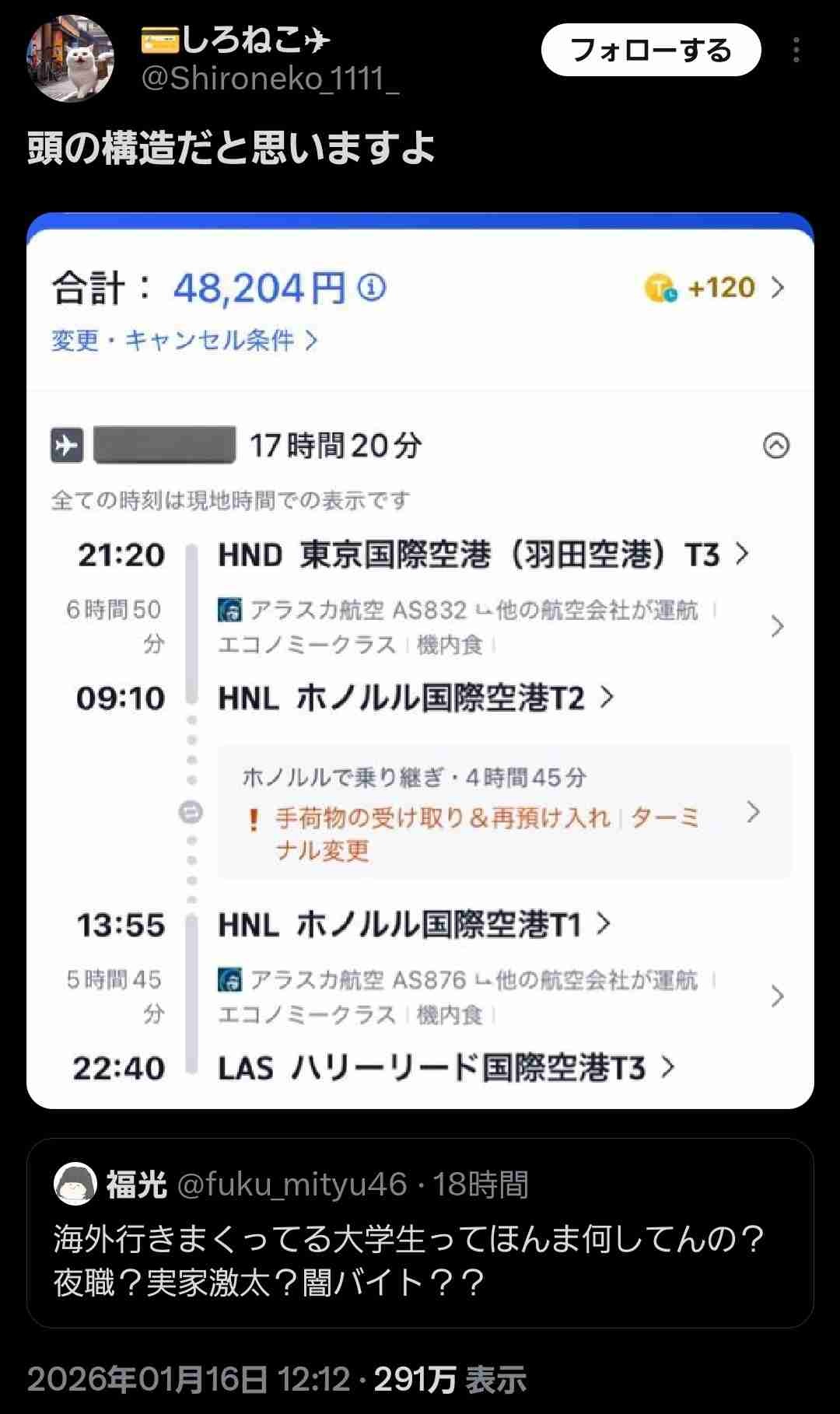 【謎】女「海外行きまくってる大学生って何してんの?夜職?実家激太?闇バイト??」 学生「頭の構造が違う」