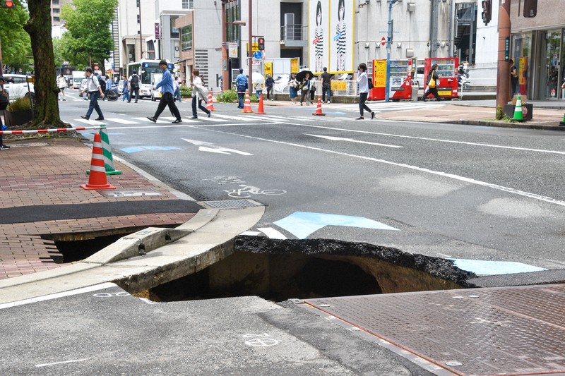 福岡県警によると、歩道から車道にかけて縦・横1・5メートルの広さで陥没した。
