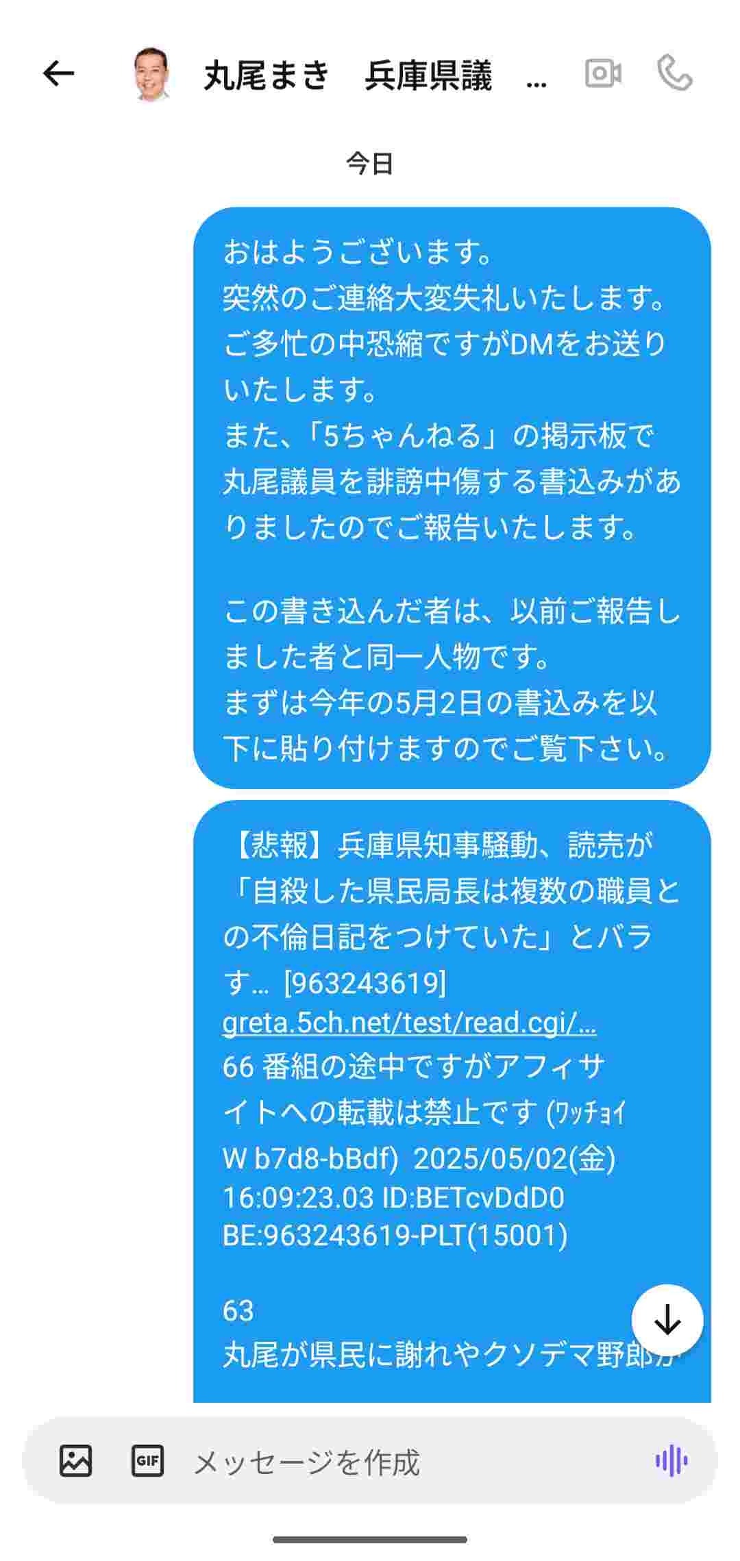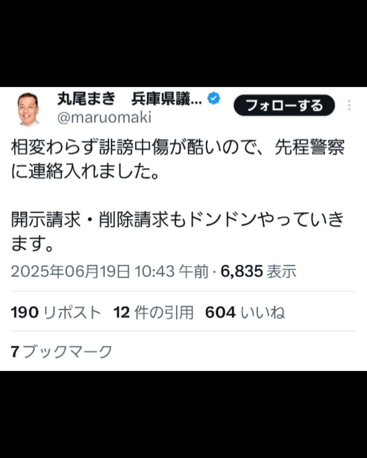 しっかり問題提起、けじめつけることが、次の社会へのルール作りにつながるのではないか。議員の仕事として重要なもののひとつと位置付けている 」とコメントしています。 【速報】兵庫県知事選めぐる県議への誹謗中傷 SNSアカウント開示請求認められる 東京地裁(読売テレビ) - Yahoo!ニュース去年の兵庫県知事選挙をめぐり、SNS上で誹謗中傷が相次いだことを受け、丸尾まき兵庫県議が東京地裁にSNSアカウントに関する情報の開示を求めていた問題で、7月18日付で東京地裁から開示請求が認められnews.yahoo.co.jp