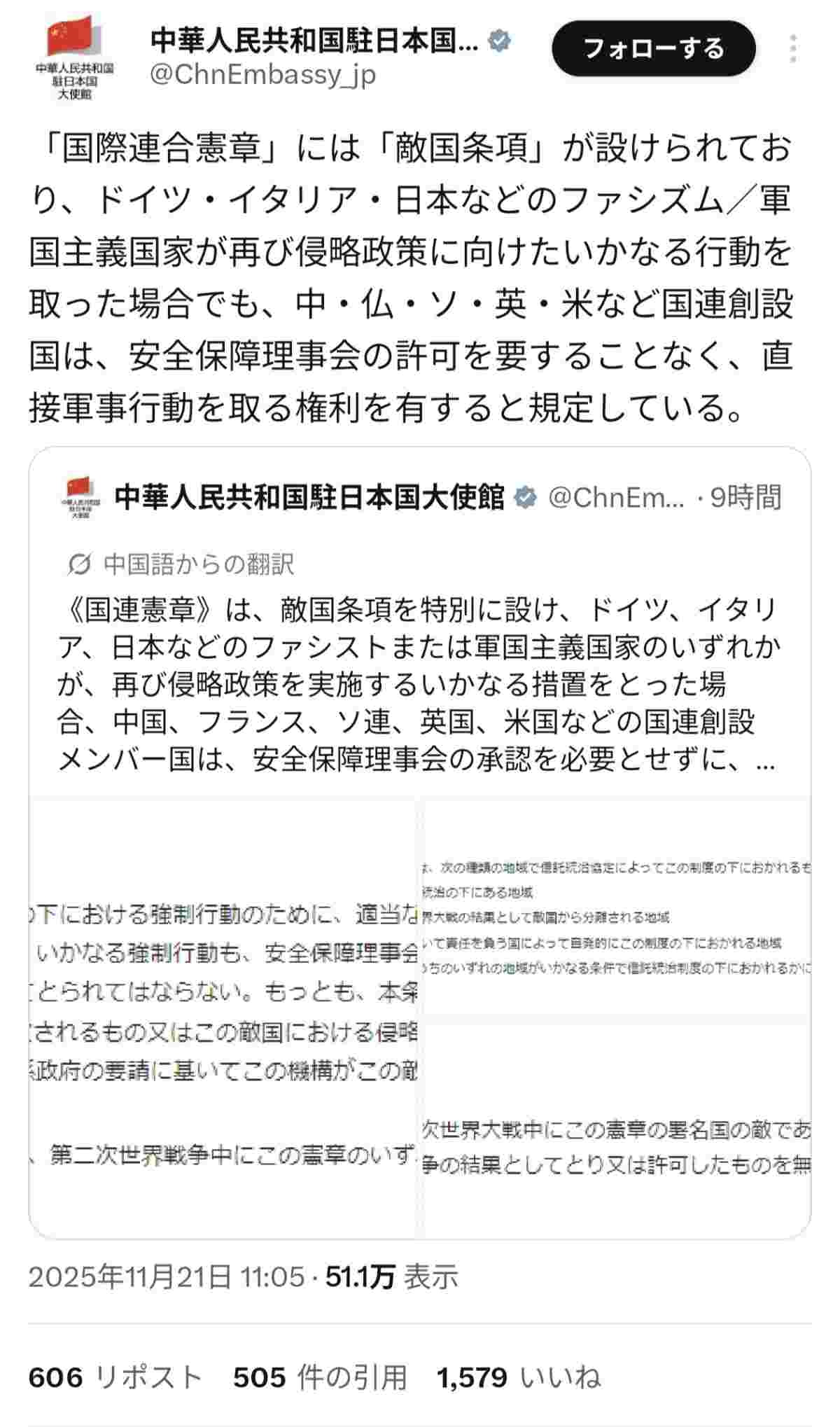 中国「国連安保理の許可なしに日本攻撃可能」 Xで旧敵国条項に言及