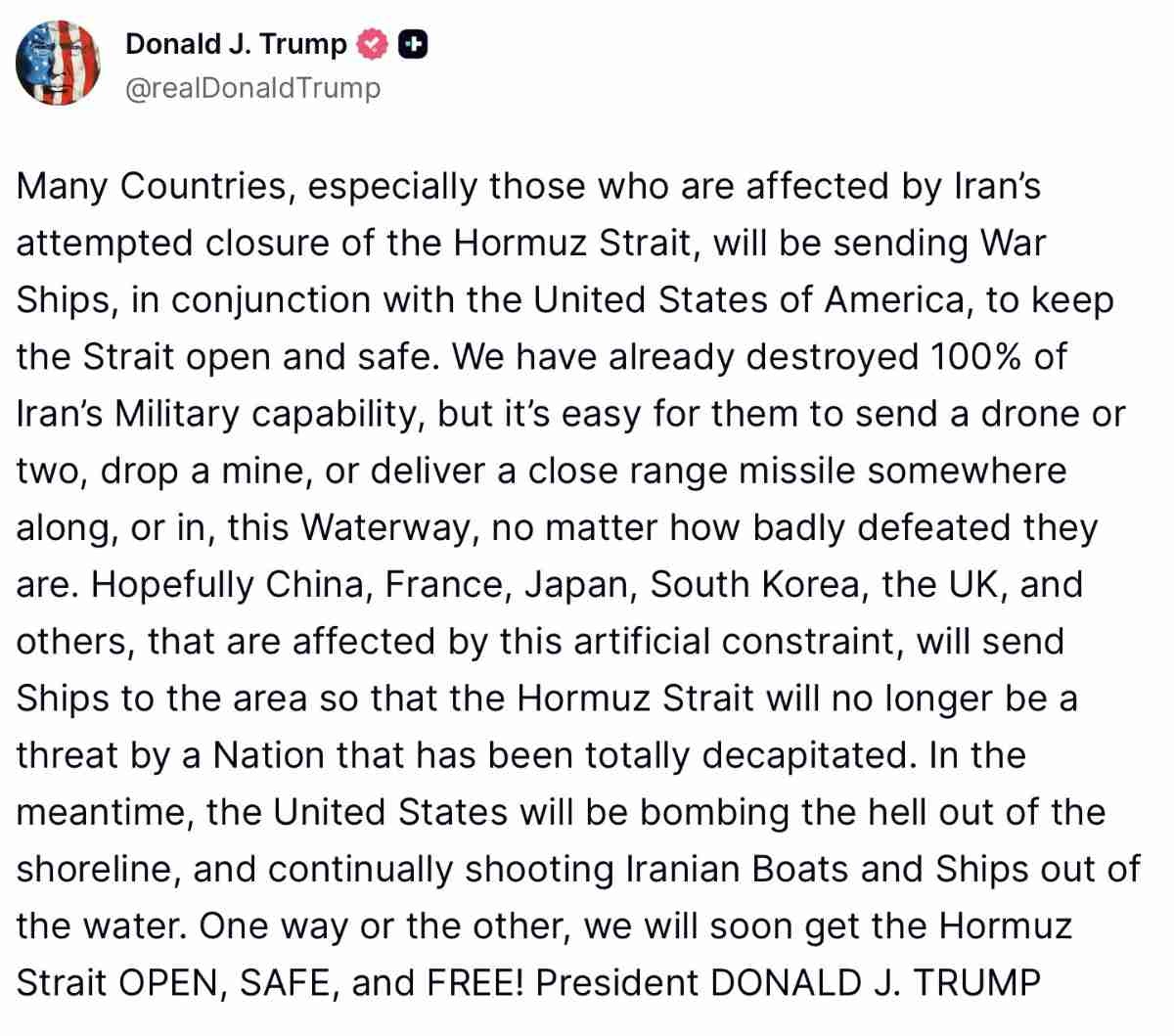 日本に艦船派遣期待とトランプ氏 ホルムズ海峡へ、中韓英仏にも(共同通信)