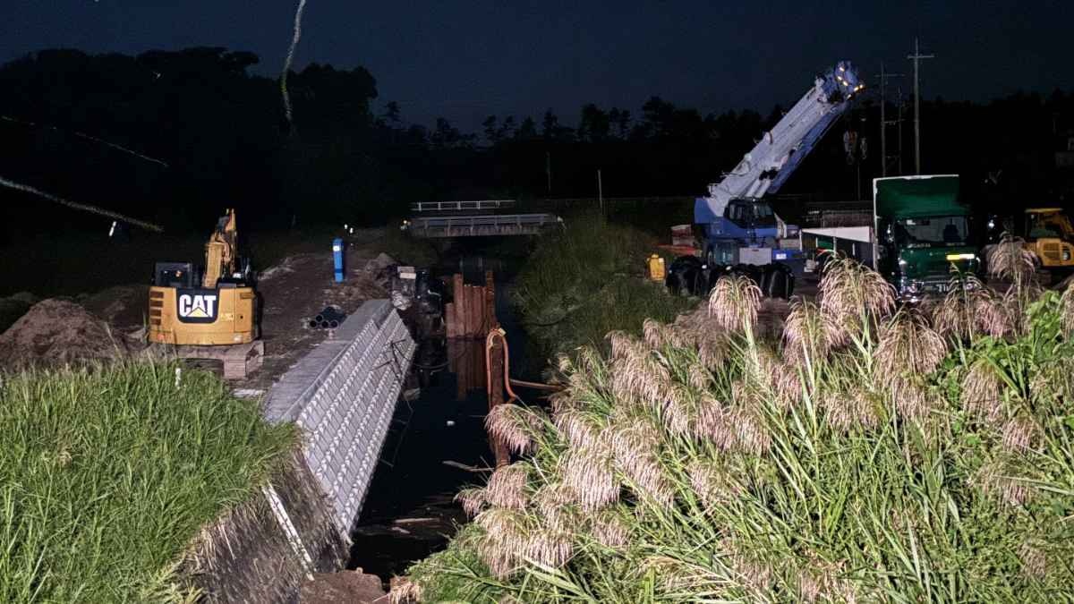 現場ではクレーンで止水板を移動させる作業が行われ、事故当時はクレーンとハンマーを取り外し、ハンマーは止水板を挟んだ状態で川の中に置かれていたということです。