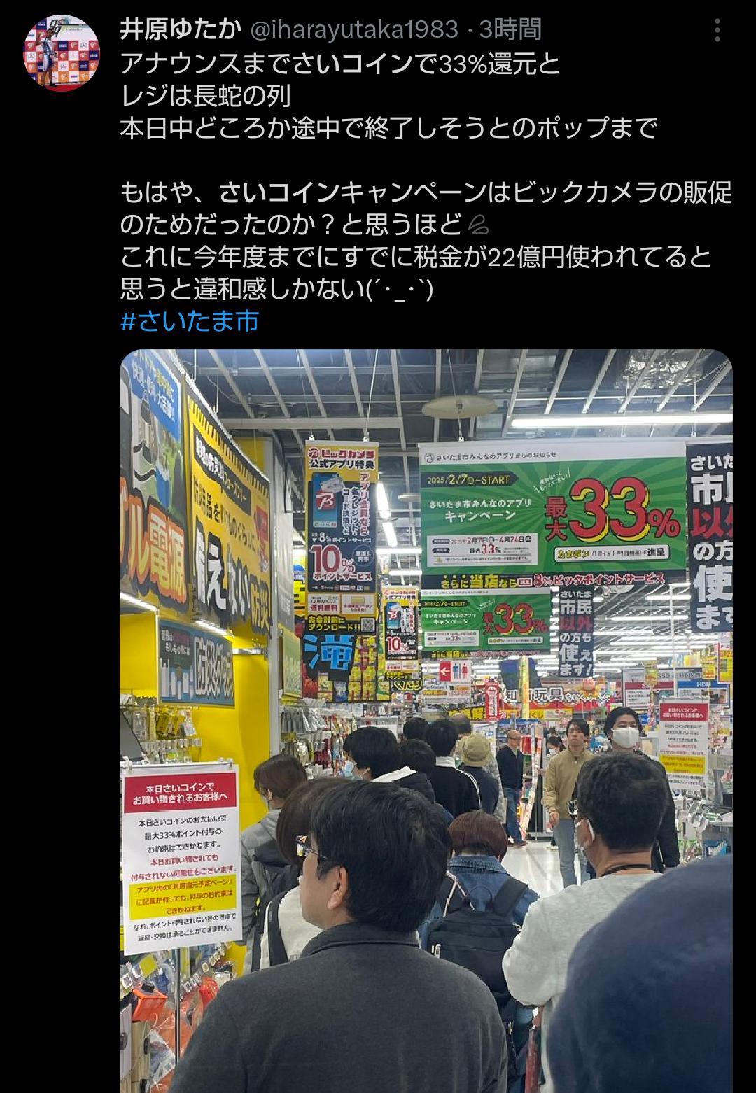 本日3月2日15時以後の「さいコイン」での決済は、還元の対象外となりますので、ご理解いただきますようお願いいたします。