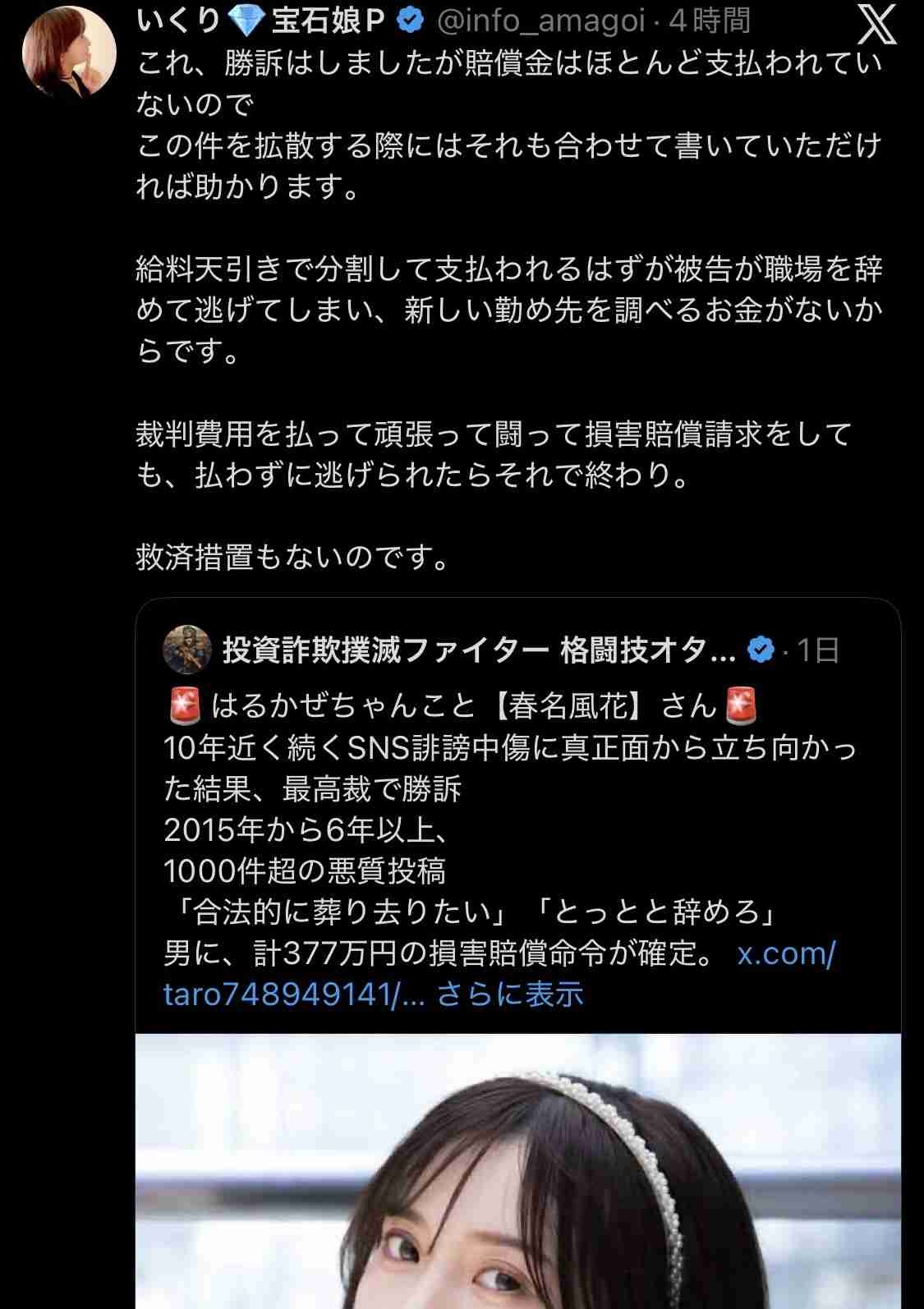 はるかぜちゃん「最高裁で勝訴して377万円支払命令出て毎月数万ずつの給料天引きを待ってたのに、相手が転職・転居して逃げ切られた」