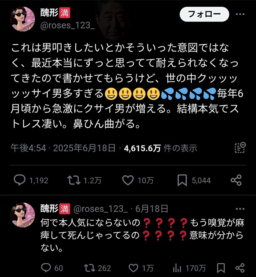 まんさん「世の中臭い男多すぎる!!!」弱男発狂