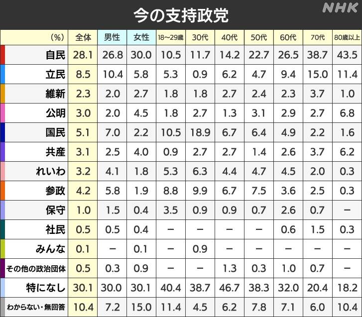 政党支持率 自民28.1% 立民8.5% 国民5.1% 支持なし30.1% | NHK https://www3.nhk.or.jp/news/html/20250707/k10014856111000.html