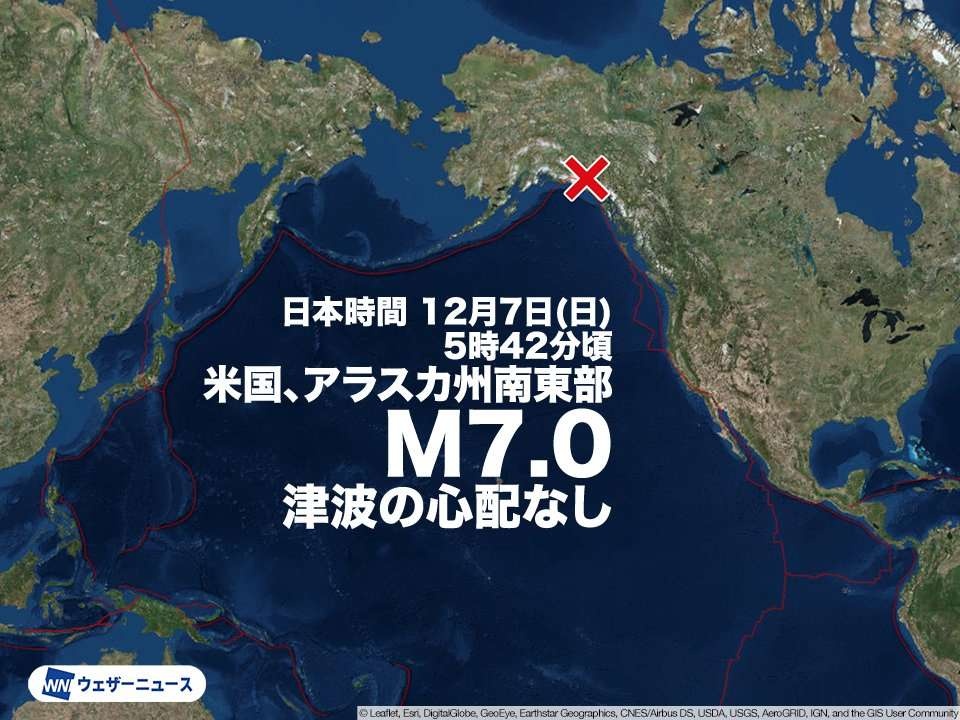 日本時間の12月7日(日)5時42分頃、海外で規模の大きな地震がありました。震源地は北米西部(米国、アラスカ州南東部)で、地震の規模(マグニチュード)は7.0と推定されます。この地震による津波被害の心配はありません。