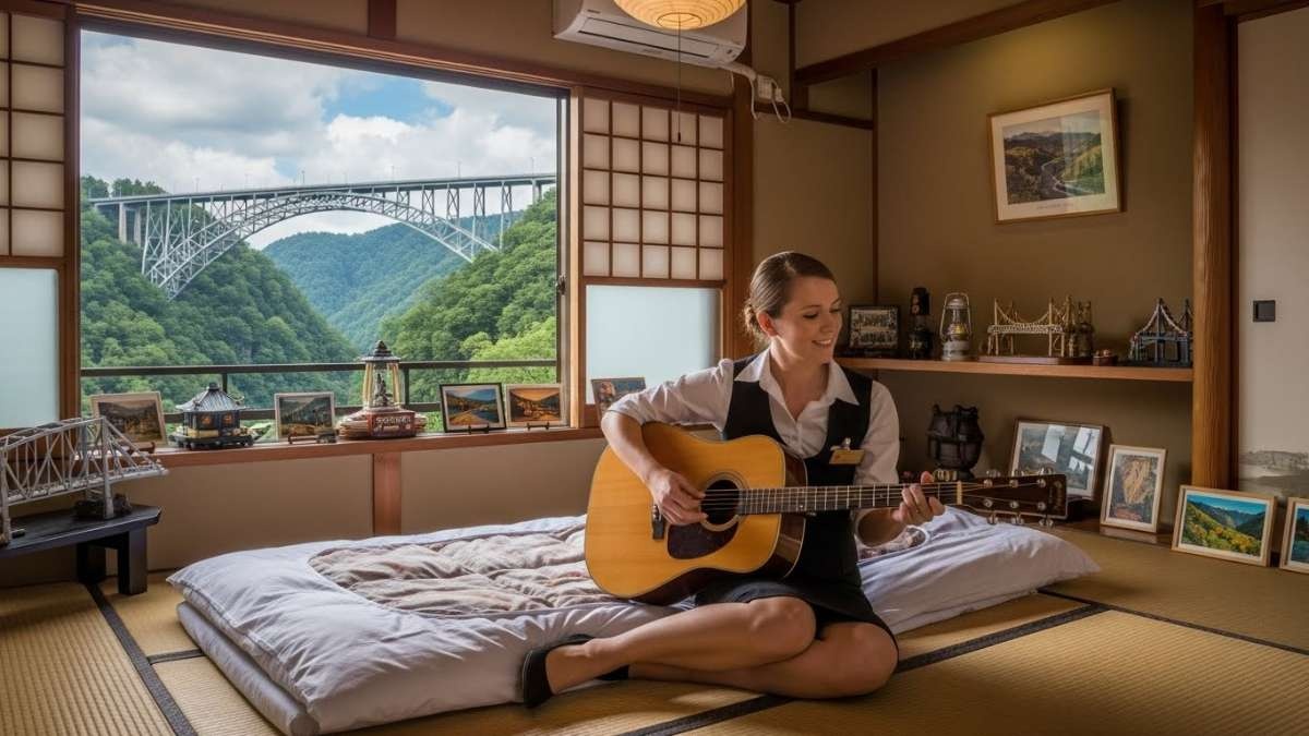 これが州歌に指定されており、スポーツの試合の前には大熱唱で盛り上がる。窓の措に見えるのは州のシンボルのニュー川峡谷橋
