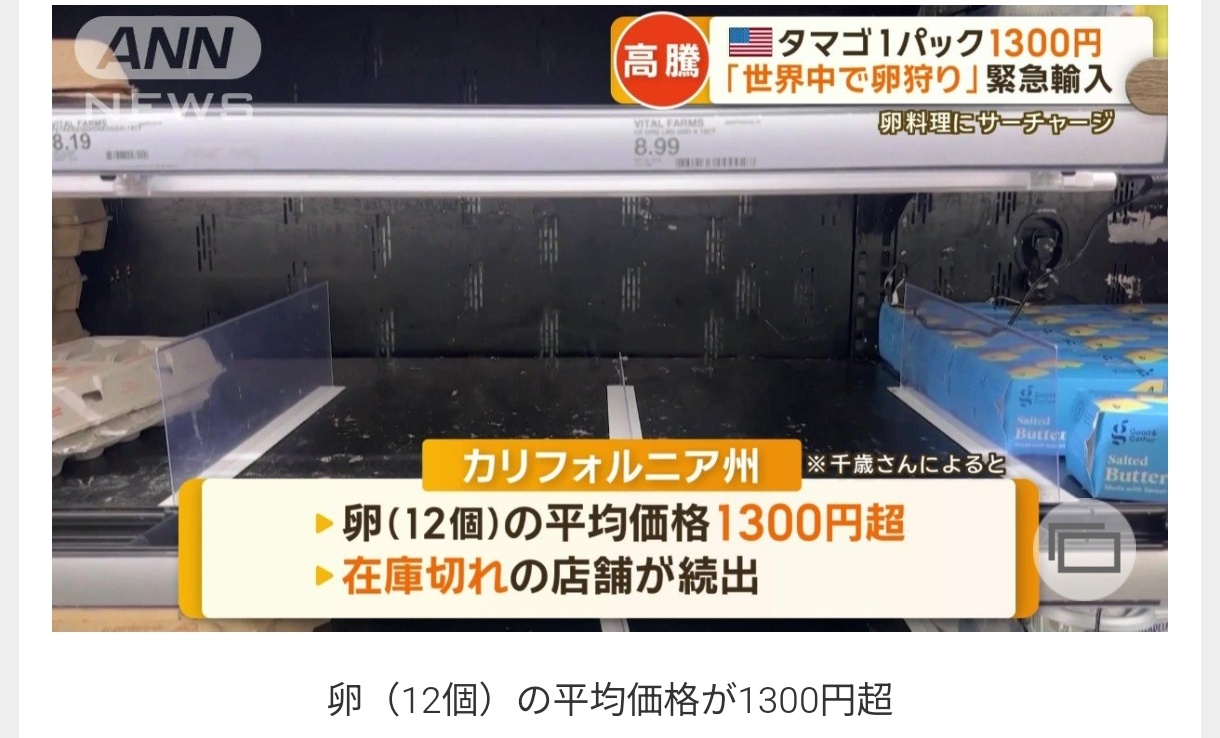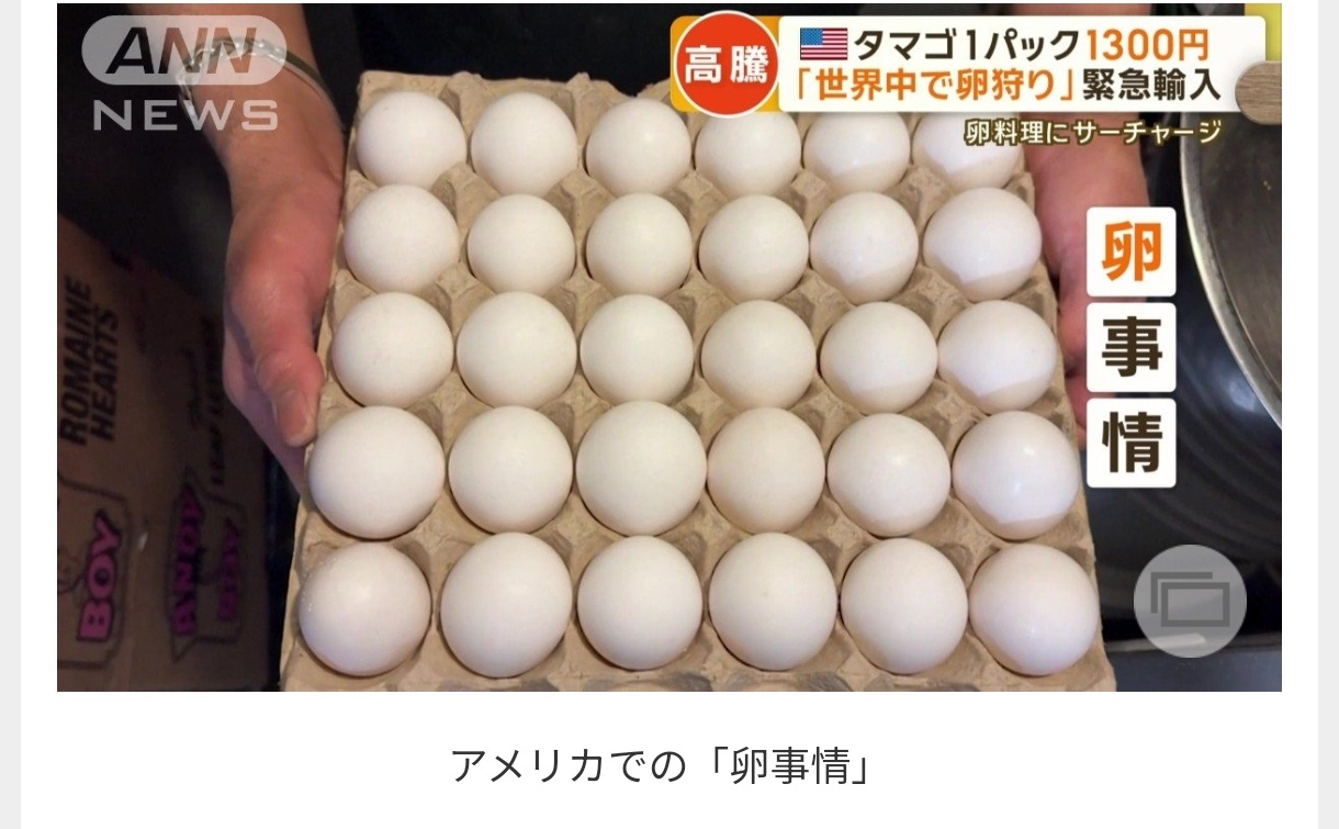 アメリカ人「🥚卵が1パック 1300円超えた😭」 値上げ続く。 飲食店では卵料理に追加料金「エッグサーチャージ」導入