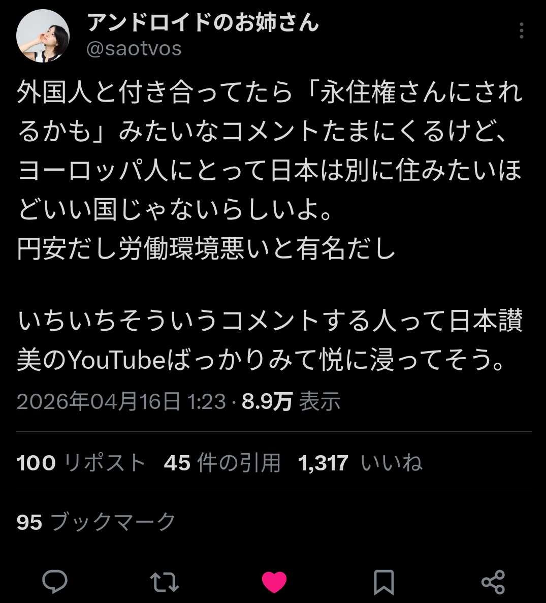 日本の女ってアジア人と付き合ってることは絶対言わないのに白人と付き合ってる時にはドヤ顔で発信するよね