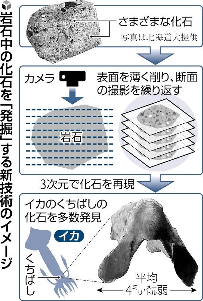 この手法で北海道で産出した握りこぶし大の岩石35個を分析すると、アンモナイトやタコ、イカなどのくちばしの化石が計1000個見つかった。イカは1億~7000万年前の地層から最多の263個見つかり、種類も40種と多様だった。チームの伊庭靖弘・北大准教授(進化古生物学)は「化石発見は偶然と職人的な経験に頼ってきたため、多くの化石が見過ごされてきた」と語る。