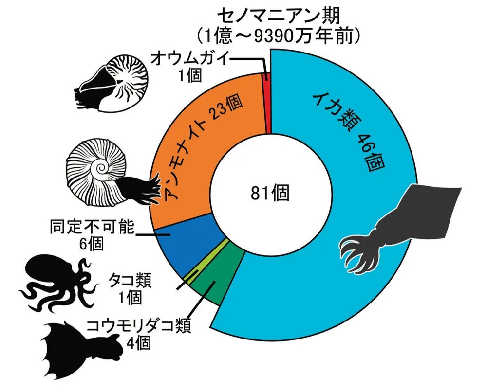 北海道各地から約1億~7000万年前の岩石35個を集めてデジタル化し、イカ類のクチバシ263個を発見。40種のイカに分類し、うち39種が新種だった。最古の化石は約1億年前で、これまでの記録を最大5500万年さかのぼった。