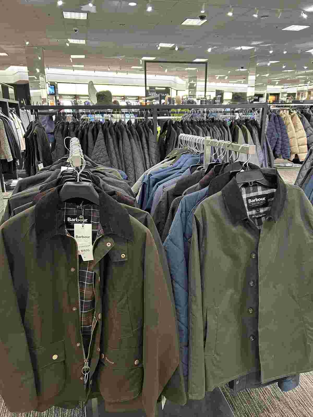 このImgur投稿の画像は、主にアパレルブランド「Barbour(バブアー)」のジャケットが店舗のハンガーラックに陳列されている様子を映しており、特に「Transport(トランスポート)」モデルやそれに類する中綿入りのショートジャケットが写っています。多くの日本のセレクトショップや小売店でも取り扱われています。