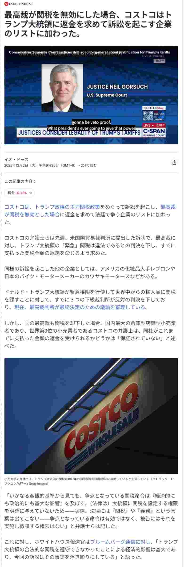 コストコ、トランプ関税が最高裁で無効の場合、返還を求めて訴えると表明