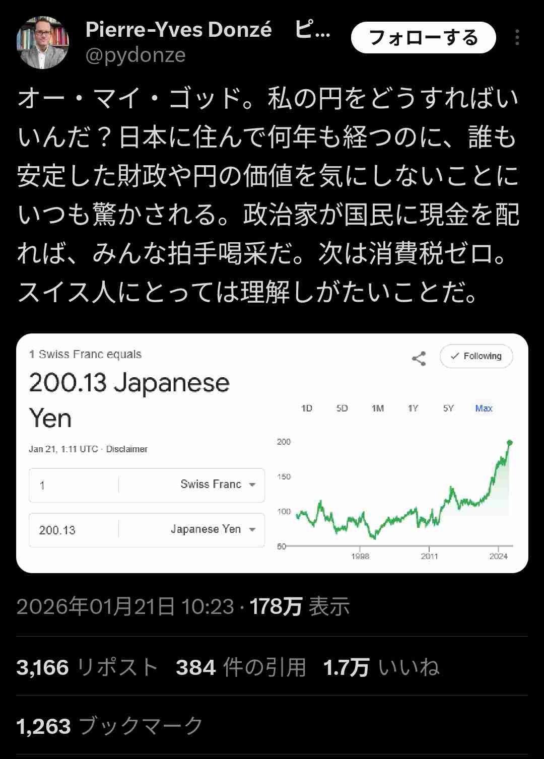 スイス人「ぐはっ!俺のジャップ円めちゃめちゃ暴落しとるんだけどどうなってるの?助けて!日本にまともな政治家おらんの?」