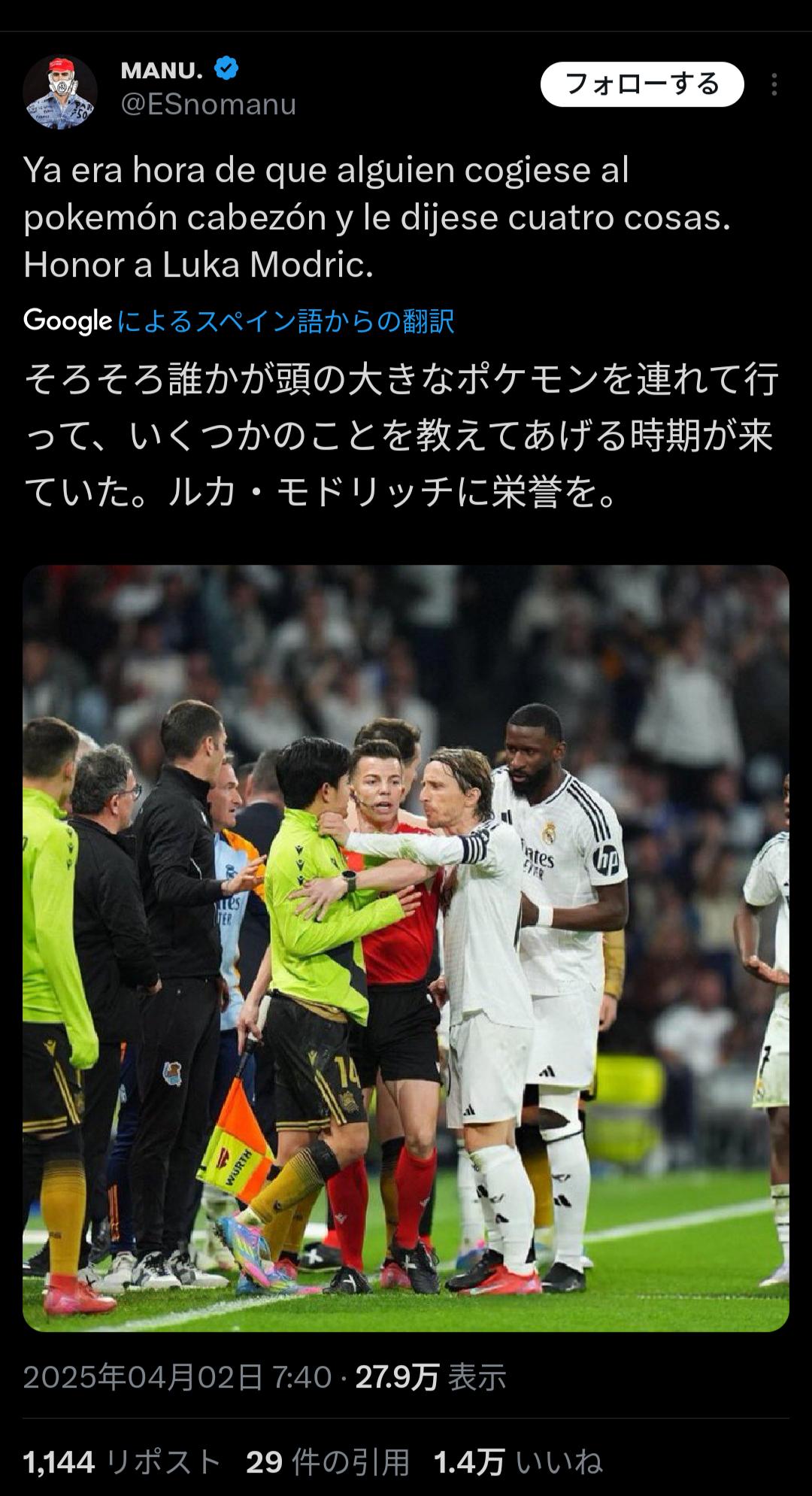 これレアルファンがモドリッチは聖人なんだあああ!!!モドリッチが怒ってるってことは久保が悪いんだあああ!ってやってるだけだからな