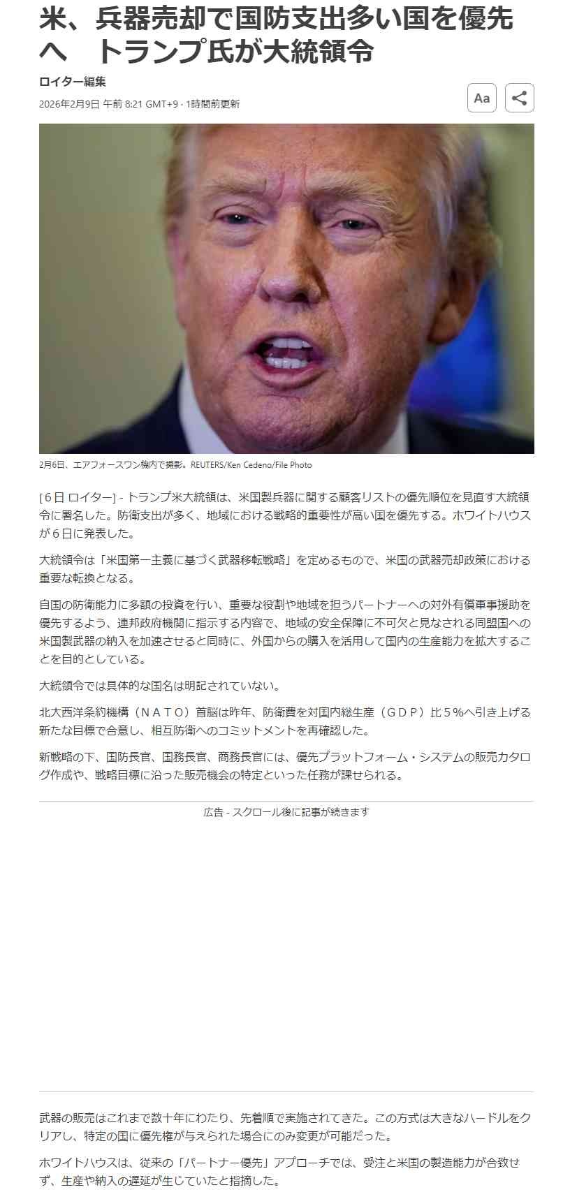 トランプ、兵器売却で国防支出多い国を優先、GDP比5%目指す日本増税でアメリカ製武器購入へ