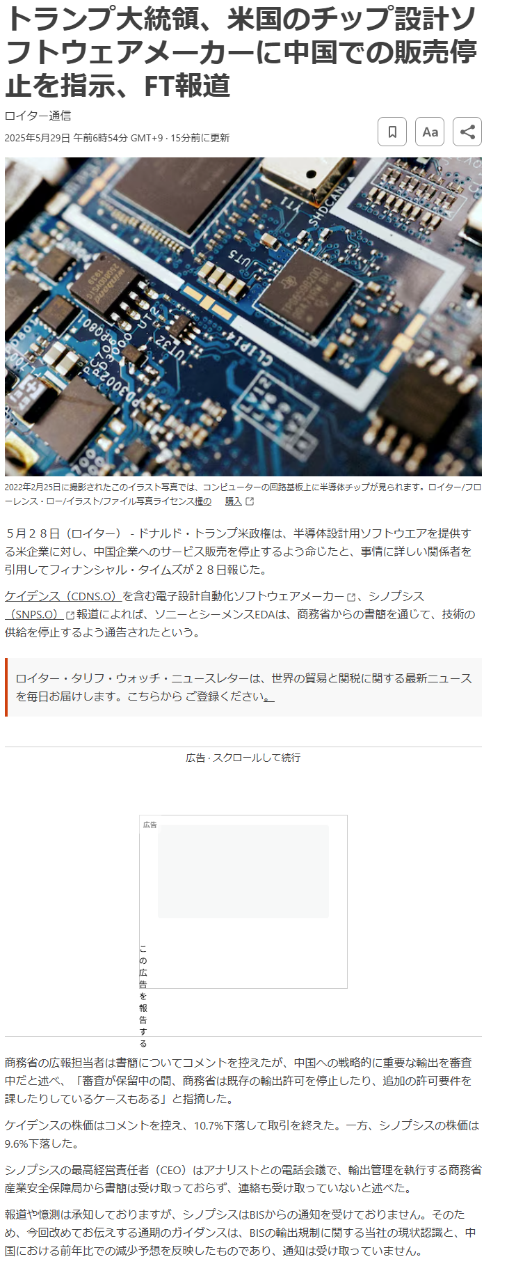 トランプ、米国のチップ設計ソフトウェアメーカーに中国での販売停止を指示へ