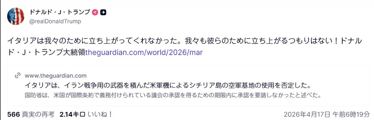 イタリアは我々のために手を差し伸べてくれなかった。だから我々もイタリアのために手を差し伸べるつもりはない! ドナルド・J・トランプ大統領