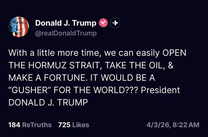 ​「もう少し時間があれば、我々は簡単にホルムズ海峡を開放し、石油を手に入れ、大儲けすることができる。 それは世界にとっての『大噴出』になるのではないか??? ドナルド・J・トランプ大統領」