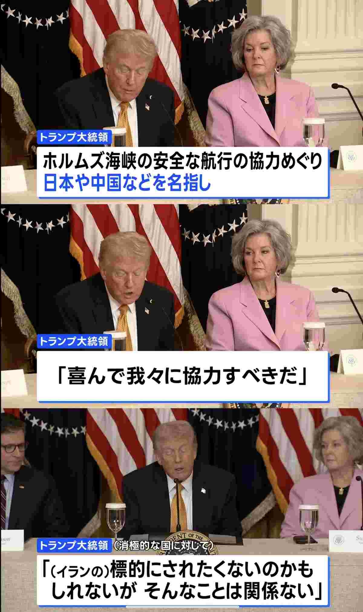 米国のトランプ大統領は16日、ホワイトハウスの会合で、イランが船舶を攻撃しているホルムズ海峡に護衛のための艦船を派遣するよう他国に求めていることについて、「我々よりもはるかに経済的にこの海峡に依存している他国に対し、強く働きかける」と述べた。その上で、石油の輸入量を念頭に、「日本は95%、中国は90%、多くの欧州諸国もかなりの割合を占めている」などと述べ、「我々は彼らに来てもらい、海峡の(安全確保を)支援をしてほしい」と強調した。