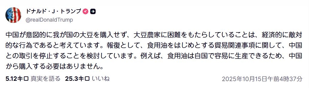 トランプ発狂、「中国が大豆を購入しないのは敵対行為、報復として、食用油を貿易関連事項に関して、中国との取引を停止する